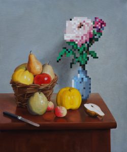 spontani događaj koji je promijenio pogled na sliku i muzej, ali i napravio značajnu transformaciju umjetnine u mem“. Vjerujem da nije mogao preciznije opisati ono što će poslije postati njegov umjetnički credo: trenutak kada slika prestaje biti artefakt i postaje fenomen, kruženje, skretanje pogleda, svojevrsni optički virus. Usto, to je možda najbolji orijentir za ulazak u njegov slikarski svijet, nešto poput unutarnjeg kompasa koji nam pokazuje gdje se slika danas zapravo nalazi. Jer u Šandrkovim radovima i remek-djela i turisti i digitalni cvjetovi i mrtve prirode i memovi nalaze se u istoj ravni, u istoj vizualnoj ekonomiji u kojoj je svaka slika tek jedna među mnogima. Upravo ono što Krešimir Purgar naziva „prelaskom iz reprezentacijskog modela slike u područje njezina fenomenalnog pojavljivanja“, kada slika „više ne obavlja funkciju stabilnog označavanja nego se pojavljuje kao događaj u perceptivnom polju“ (Purgar, Pictorial Appearing. Image Theory After Representation, str. 14-17). Šandrk to ne teoretizira; on to slika. Šandrkov rad proizlazi iz svijesti da suvremena slika nastaje u tehničkom
